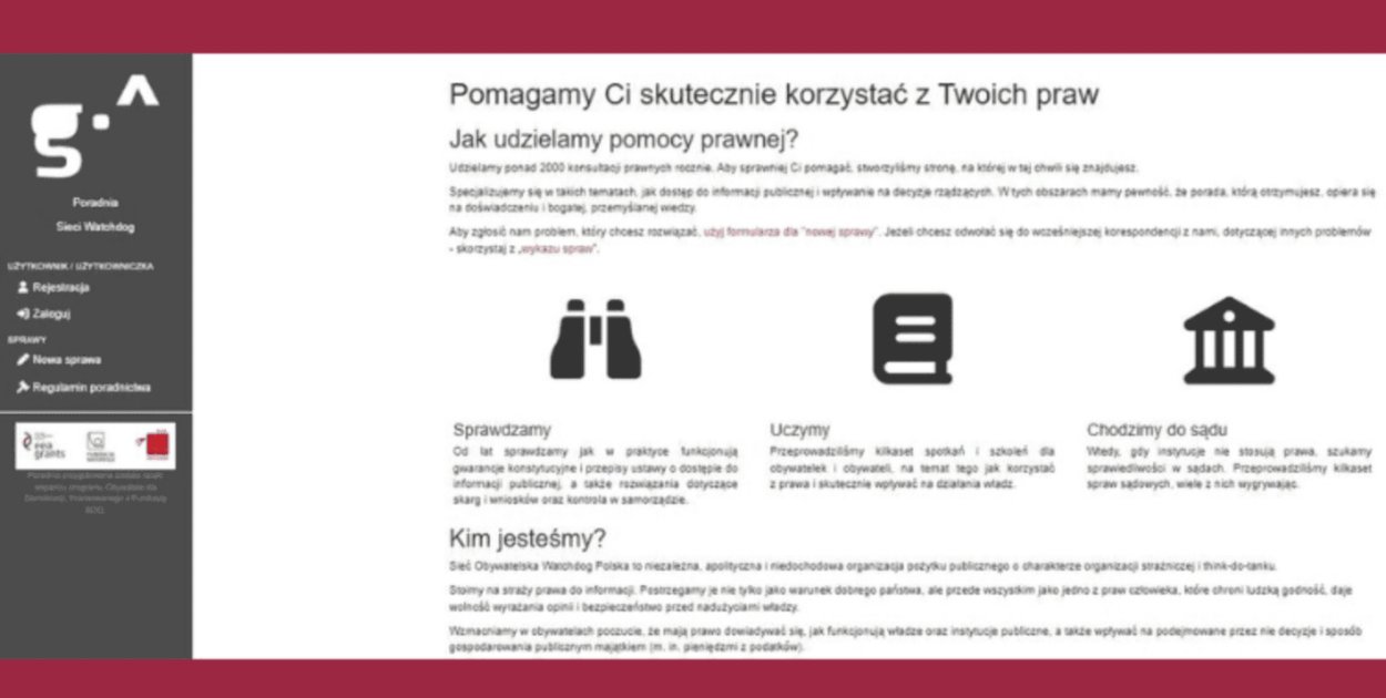 Sieć Obywatelska Watchdog Polska działa od ponad 20 lat, zajmując się wspieraniem obywateli w korzystaniu z prawa do informacji publicznej. Organizacja udziela bezpłatnych porad prawnych, szkoli oraz prowadzi działania na rzecz jawności życia publicznego. Poradnia, funkcjonująca pod adresem porady.siecobywatelska.pl, odpowiada rocznie na około 2000 zapytań dotyczących m.in. dokumentów urzędowych, jawności czy bezczynności organów administracji.