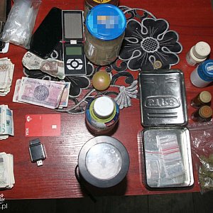 Podczas przeszukania mieszkania oraz przynależnego garażu funkcjonariusze ujawnili susz roślinny, substancję w formie kryształu oraz biały proszek. Łączna waga zabezpieczonych środków wyniosła blisko 1,5 kilograma. Ponadto policjanci znaleźli wagę elektroniczną, woreczki strunowe, młynek, osiem telefonów komórkowych oraz gotówkę w kwocie blisko 27 tysięcy złotych. W lokalu ujawniono również 2 520 sztuk papierosów bez polskich znaków akcyzy.