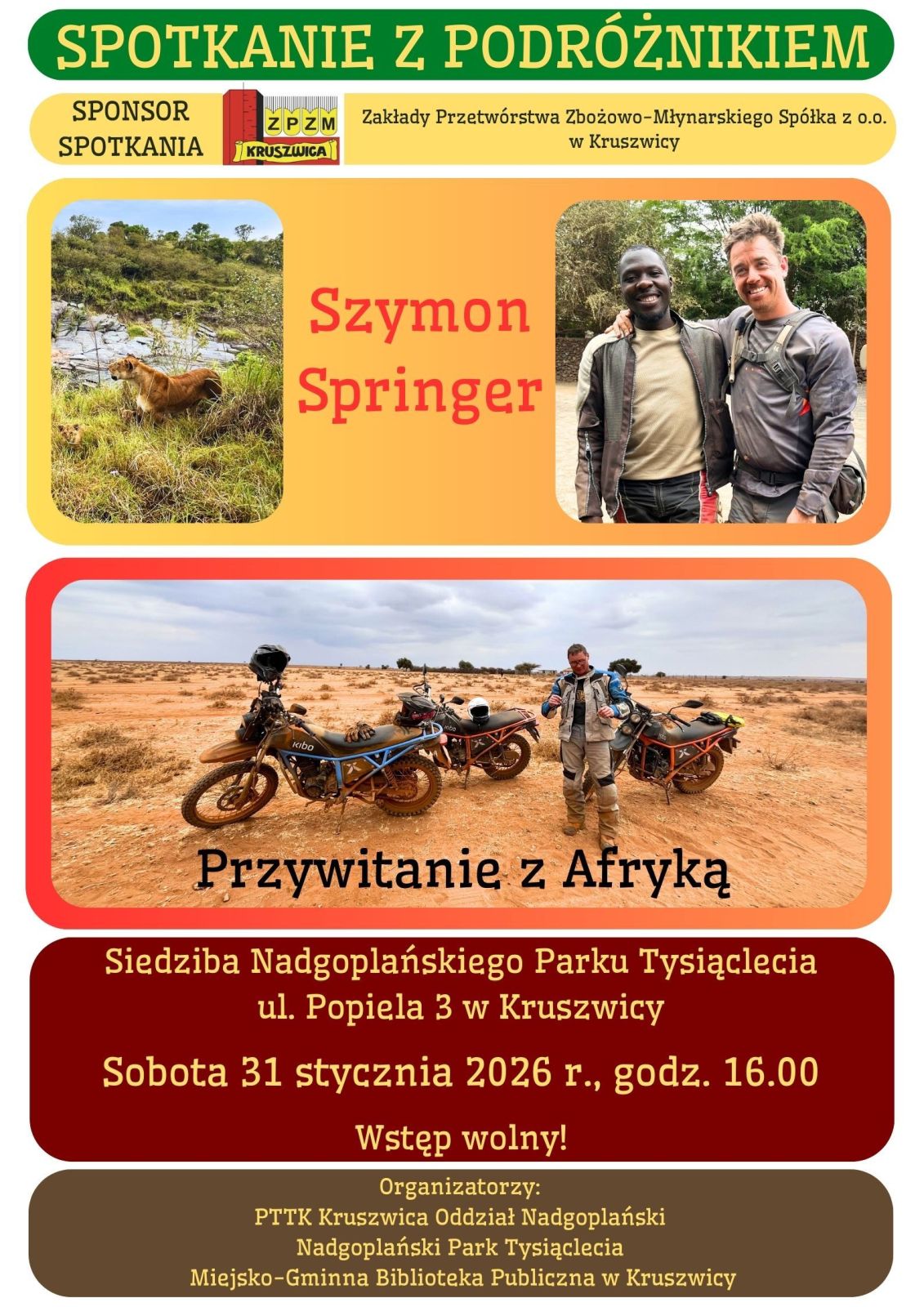Gościem wydarzenia będzie Szymon Springer, który opowie o swojej wyprawie do Afryki. Podróżnik znany jest z działalności vlogowej oraz zainteresowań związanych z motocyklami, górskimi wędrówkami i morsowaniem.