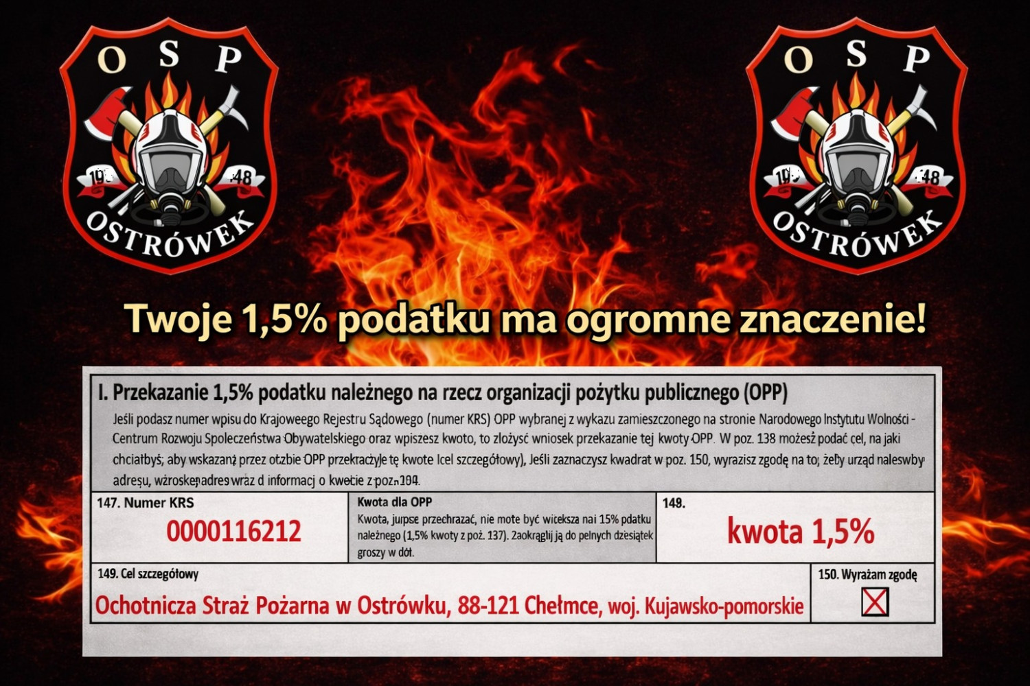 Przekazanie 1,5% podatku odbywa się poprzez wskazanie numeru KRS organizacji pożytku publicznego w rocznym zeznaniu podatkowym. W przypadku wsparcia Ochotnicza Straż Pożarna w Ostrówku należy wpisać: