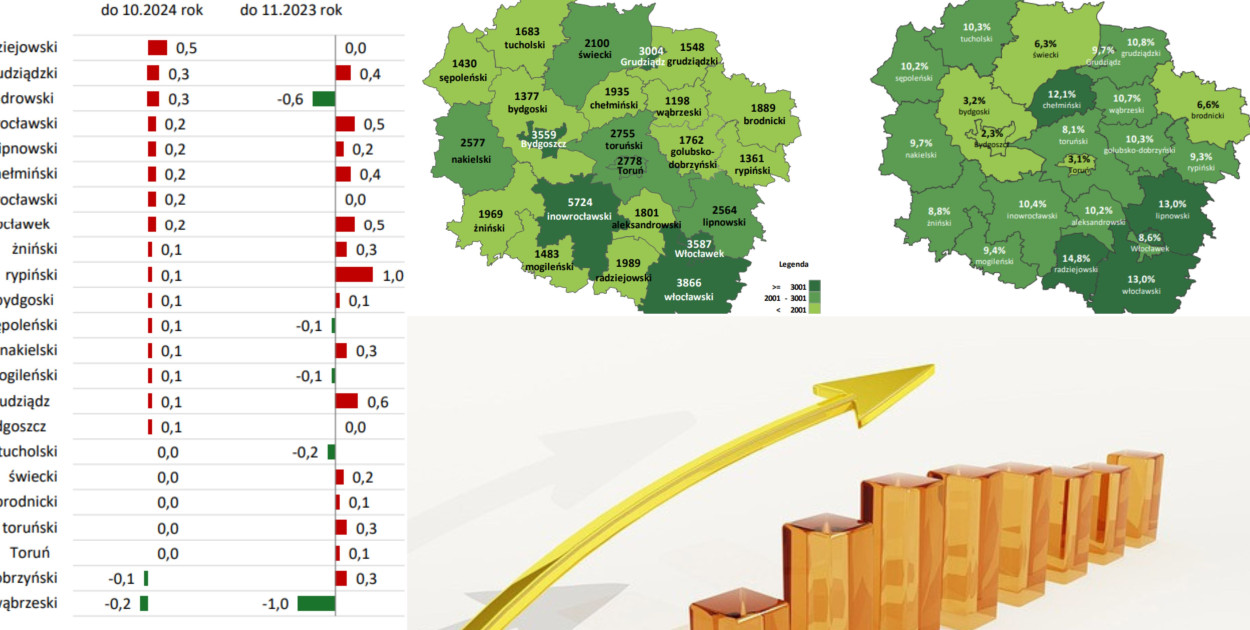 Najniższe bezrobocie w regionie odnotowano w Bydgoszczy (2,3%), a najwyższe w powiecie radziejowskim (14,8%). W ciągu miesiąca wzrost stopy bezrobocia zaobserwowano w 16 powiatach, podczas gdy w 5 pozostała ona na niezmienionym poziomie. W skali roku liczba bezrobotnych wzrosła w 17 powiatach, spadła w 6, a w jednym utrzymała się na dotychczasowym poziomie. Najwięcej bezrobotnych w liczbach bezwzględnych jest w powiecie inowrocławskim. Według danych na koniec listopada 2024 roku, w tym powiecie było zarejestrowanych najwięcej osób bezrobotnych – stanowiły one 10,6% ogółu bezrobotnych w województwie kujawsko-pomorskim