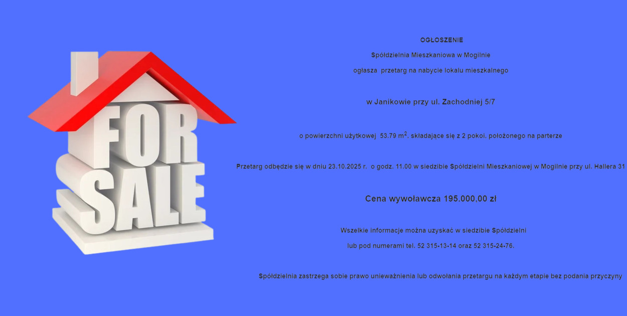 Spółdzielnia Mieszkaniowa w Mogilnie ogłosiła przetarg na sprzedaż lokalu mieszkalnego położonego w Janikowie przy ul. Zachodniej 5/7.