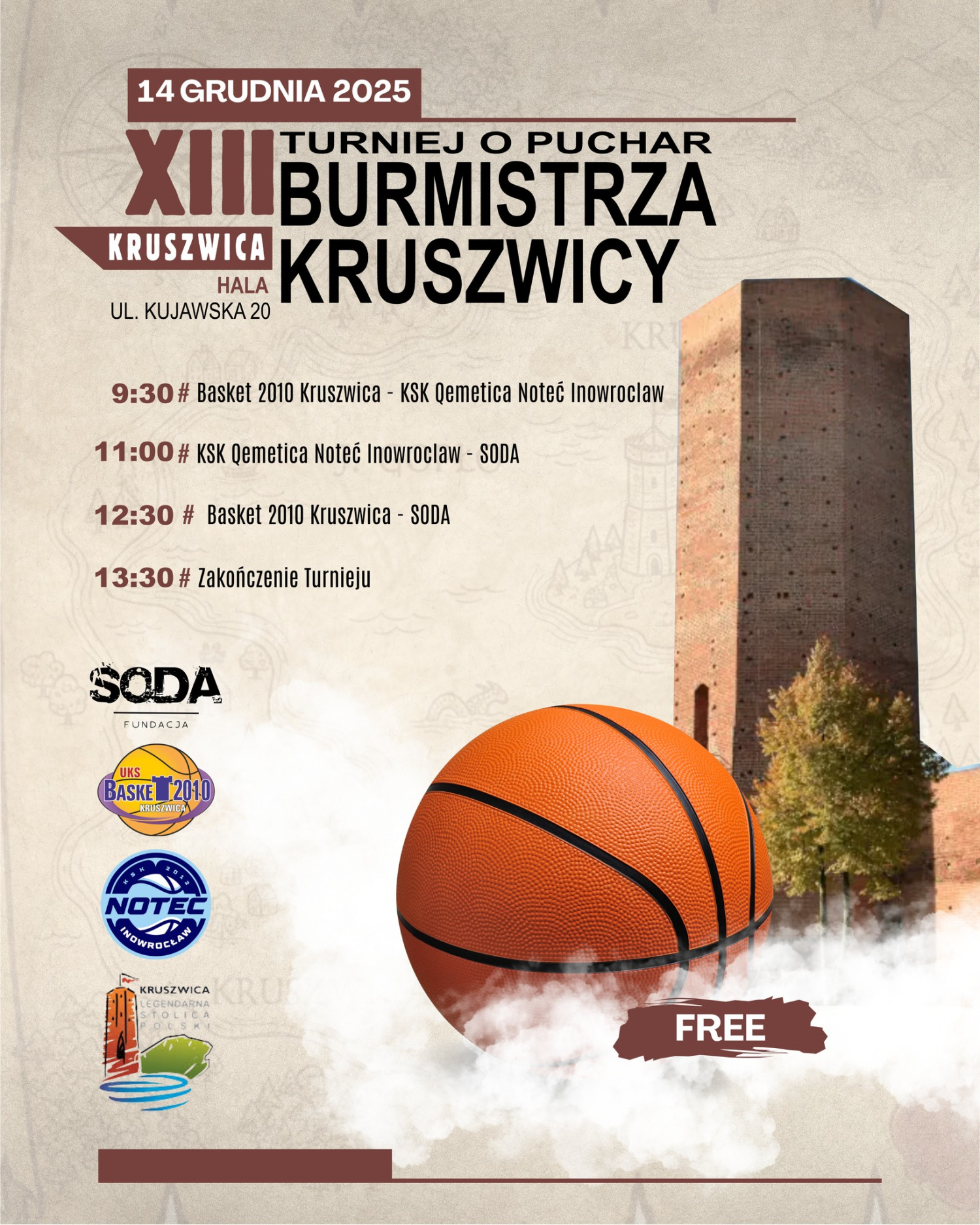 W turnieju wezmą udział zespoły: Basket 2010 Kruszwica, KSK Qemetica Noteć Inowrocław oraz drużyna SODA. Rywalizacja rozpocznie się o godz. 9.30 meczem Basket 2010 Kruszwica z KSK Qemetica Noteć Inowrocław. Kolejne spotkania zaplanowano na godz. 11.00 oraz 12.30. Zakończenie turnieju przewidziano około godz. 13.30.