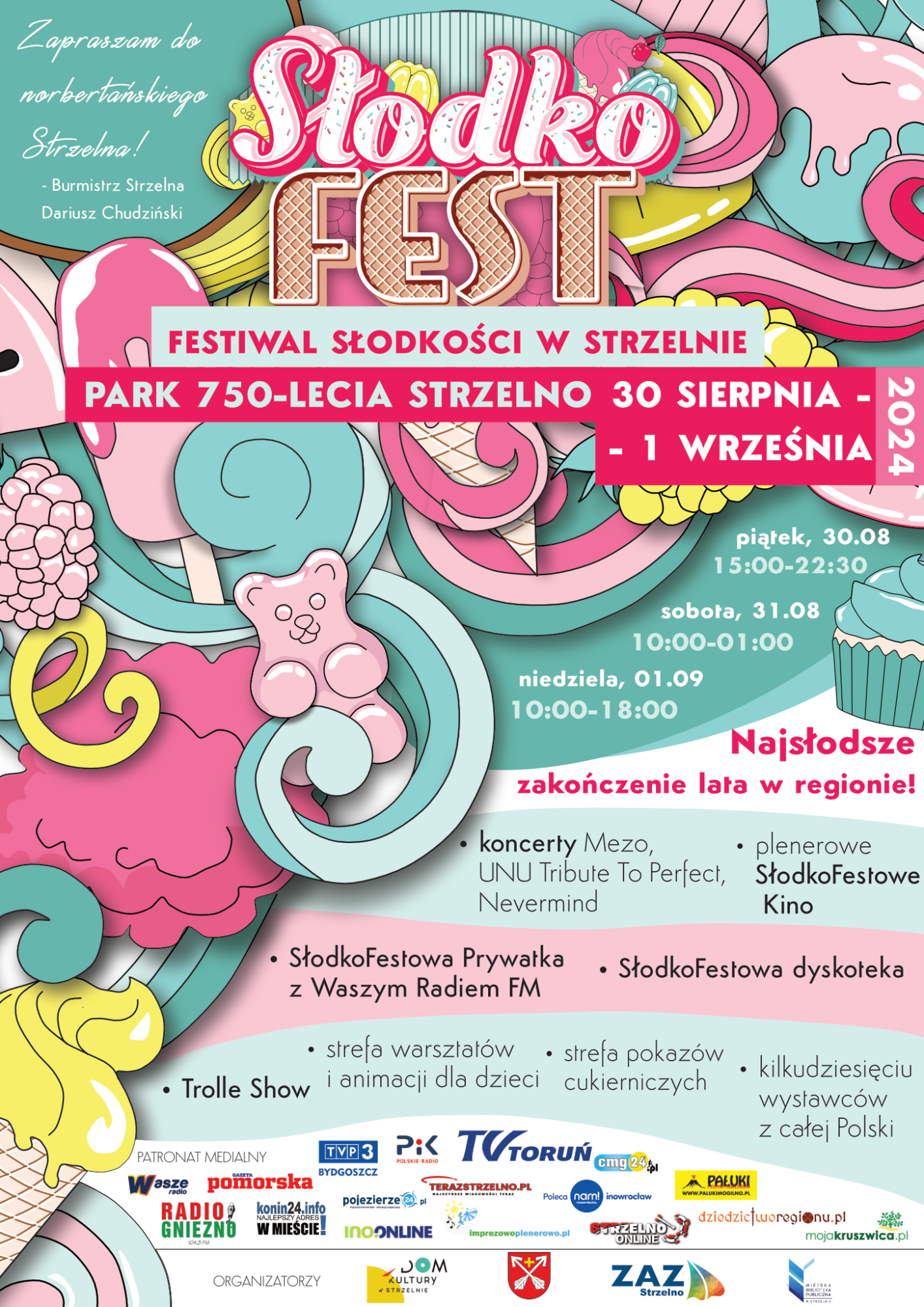 Ale od początku. Mamy nadzieję, że już wiecie, że SłodkoFest odbędzie się w dniach 30.08 (15:00-22:30), 31.08 (10:00-01:00) oraz 01.09 (10:00-18:00). Wówczas to będziemy Was oczekiwać w Parku 750-lecia przy ul. Parkowej w Strzelnie. Niektórzy mogą się zastanawiać „skąd te nagłe przenosiny z rynku?”. Odpowiadamy – trzeba przywrócić trochę życia w miejsce, które przez dziesiątki lat było centrum życia kulturowego Strzelna! Wierzymy, że komary nas nie zjedzą, a to Wy będziecie mogli zajadać się smakołykami przygotowanymi przez naszych wystawców!