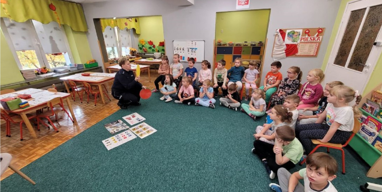 Tam podczas pogadanki zaprezentowali umundurowanie policjanta i opowiedzieli czym zajmuje się policja. Podczas spotkania były też zajęcia z profilaktyki i edukacja podstawowych reguł dla pieszych. Dzieci uczyły się pokonywać jezdnię kierując się zasadą lewej ręki. Ważne było także jak działa sygnalizator świetlny.