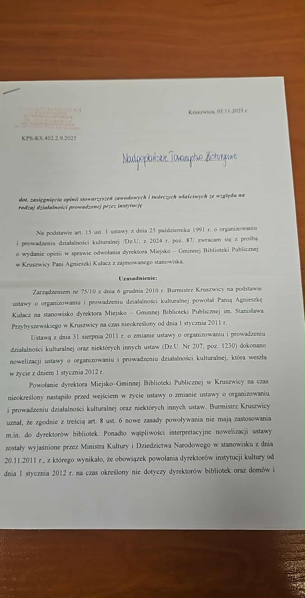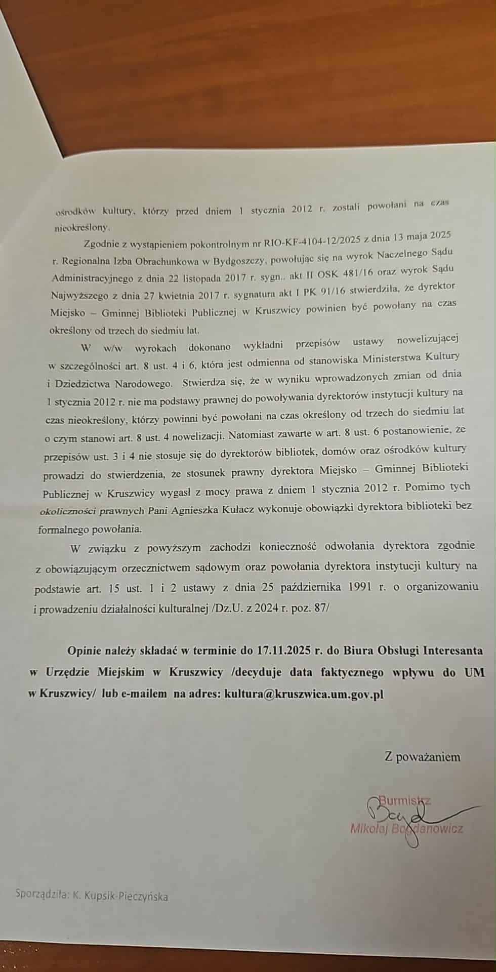 - Ustawą z dnia 31 sierpnia 2011 roku o zmianie ustawy o organizowaniu i prowadzeniu działalności kulturalnej oraz niektórych innych ustaw dokonano nowelizacji ustawy o organizowaniu i prowadzeniu działalności kulturalnej, która weszła w życie z dniem 1 stycznia 2012 roku. Powołanie dyrektora na czas nieokreślony nastąpiło przed wejściem oraz niektórych innych ustaw. Burmistrz Kruszwicy uznał, że zgodnie z treścią art. 8 ust. 6 nowe zasady powoływania nie mają zastosowana m.in. do dyrektorów bibliotek. Ponadto wątpliwości interpretacyjne nowelizacji ustawy zostały wyjaśnione przez Ministra Kultury i Dziedzictwa Narodowego w stanowisku z dnia 20 listopada z którego wynikało, że obowiązek powołania dyrektorów instytucji kultury od dnia 1 stycznia 2012 roku na czas określony nie dotyczy dyrektorów bibliotek oraz domów i ośrodków kultury, którzy przed dniem 1 stycznia 2012 roku zostali powołania na czas nieokreślony - czytamy w piśmie do stowarzyszeń.