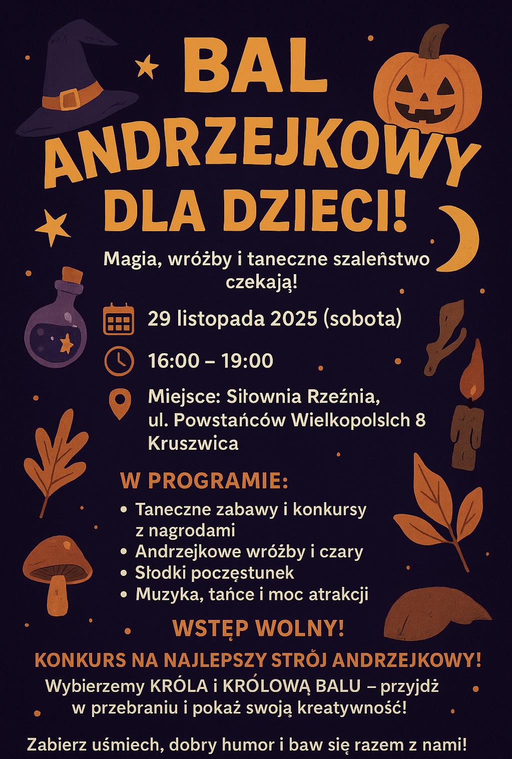 W programie przewidziano również wróżby andrzejkowe oraz różnego rodzaju atrakcje taneczne. Udział w wydarzeniu jest bezpłatny. Podczas balu odbędzie się konkurs na najlepszy strój andrzejkowy, w ramach którego wyłonieni zostaną król i królowa balu.