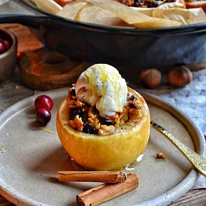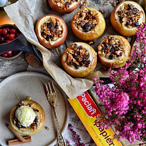 Jabłka najlepsze są na ciepło z gałką lodów waniliowych – kontrast temperatur i tekstur podbija smak i daje efekt deseru restauracyjnego. Do tego kleks gęstego jogurtu naturalnego, miód, cynamon – miksujmy dodatki zgodnie z własnymi preferencjami. Chcąc przygotować wersję bardziej dziecięcą, możemy zrezygnować z cynamonu i dodać do środka krówki lub posiekaną czekoladę.