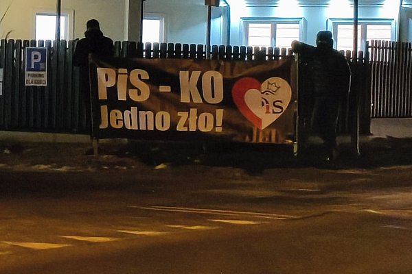 19.01.2026 Zamaskowani protestujący czekają na Czarnka w Kruszwicy. Mają transparent [VIDEO]