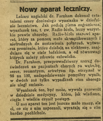 W materiałach reklamowych z lat 20. zachowały się opisy przedstawiające Radio-Biolę jako „najowszy wynalazek dr. Farnhama”, lekarza rzekomo działającego w Anglii. Urządzenie miało, zgodnie z przekazem, „leczyć pod gwarancją wszelkie chroniczne cierpienia”, w tym: reumatyzm, artretyzm, paraliż, choroby nerek i wątroby, otyłość, oraz wiele innych schorzeń.