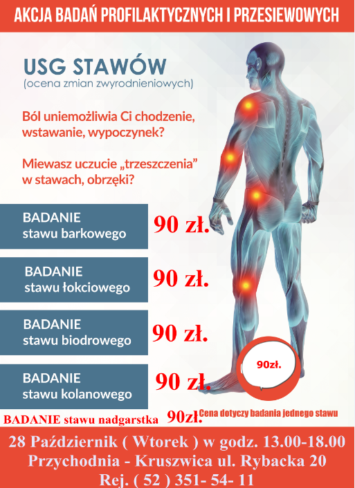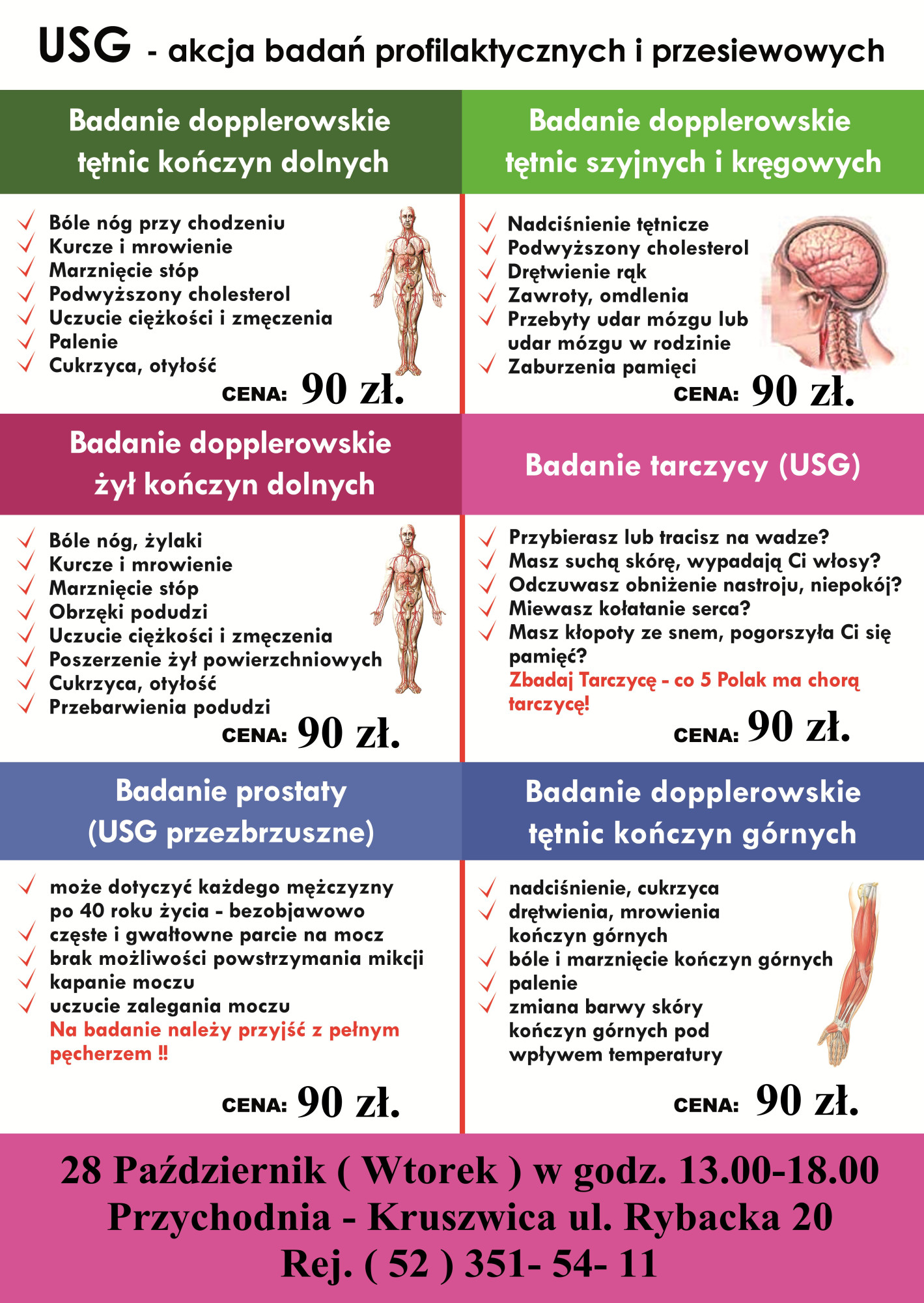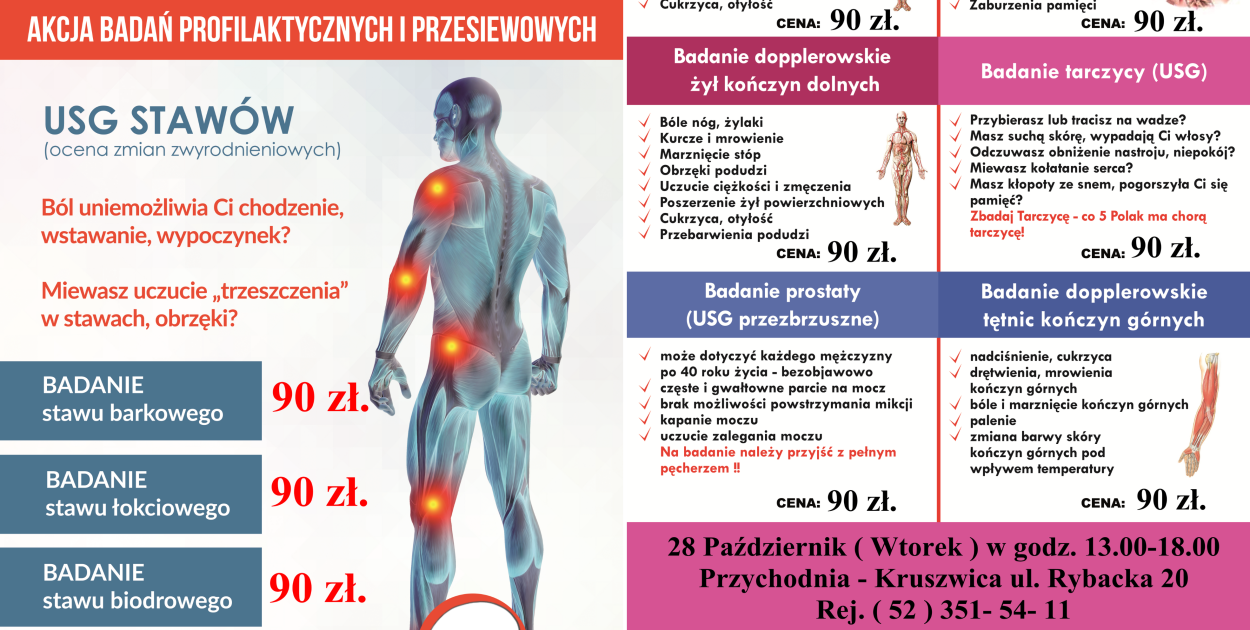- Zainteresowani mieszkańcy będą mogli skorzystać z badań USG i dopplerowskich obejmujących m.in. tętnice kończyn dolnych i górnych, żyły, tarczycę, tętnice szyjne oraz prostatę.