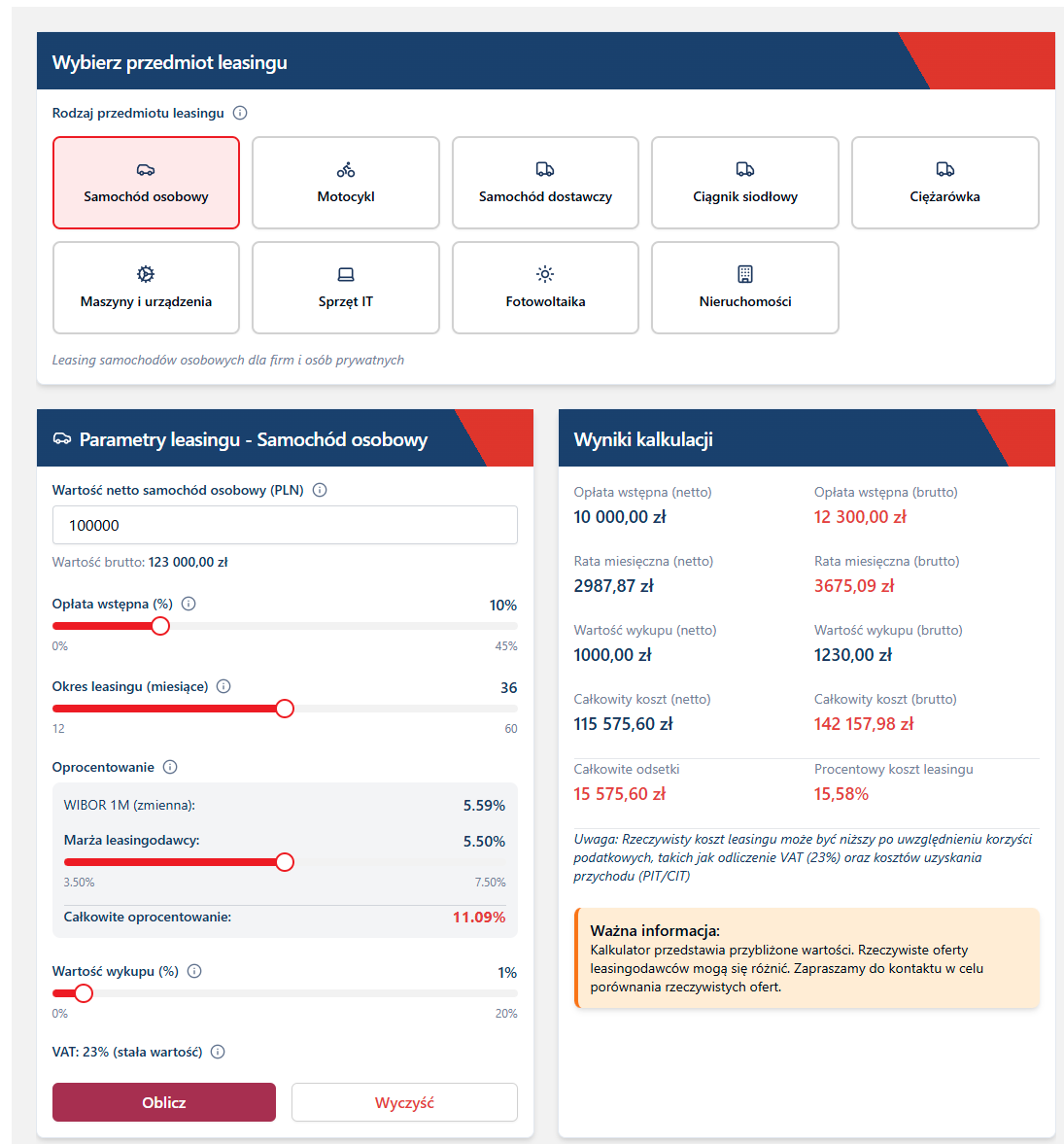 Kalkulator leasingowy daje szybki podgląd sytuacji, ale nie zastąpi indywidualnej oferty. Rata, którą widzisz w symulacji, opiera się na ogólnych założeniach, a firma leasingowa zawsze uwzględnia dodatkowe czynniki.