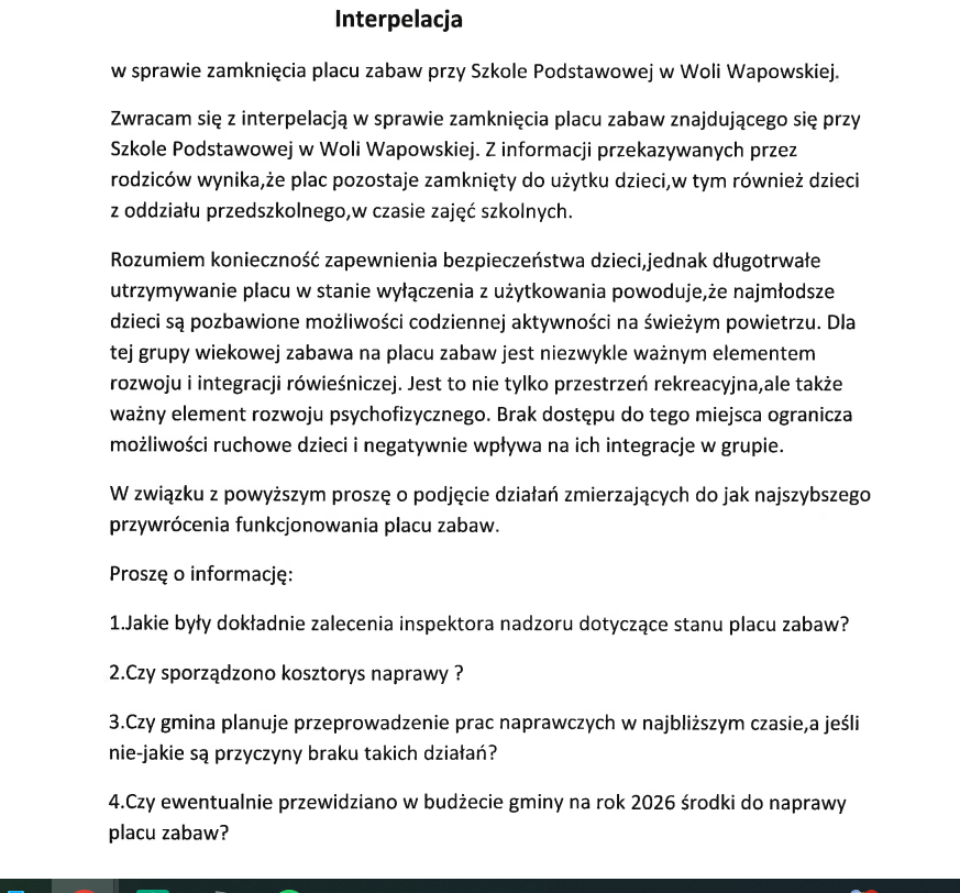 Radny Augustyniak zwrócił się do władz gminy z prośbą o podjęcie działań zmierzających do jak najszybszego przywrócenia funkcjonowania placu zabaw. Poprosił również o informacje dotyczące zaleceń inspektora nadzoru, kosztorysu napraw, planowanych prac oraz ewentualnego uwzględnienia środków na remont w budżecie gminy na rok 2026.