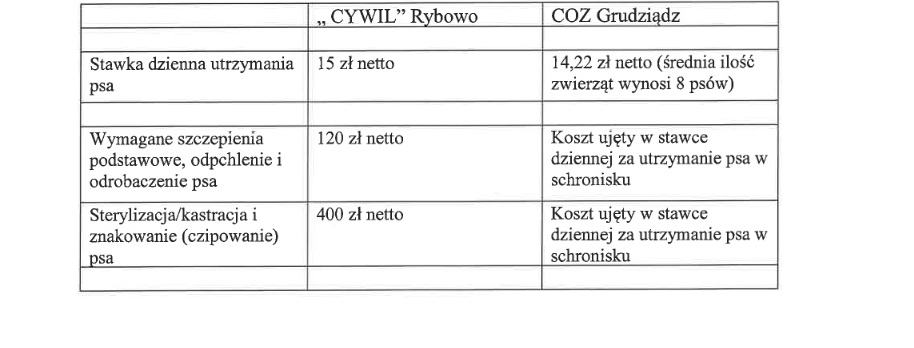 W odpowiedzi przedstawiono także porównanie kosztów jednostkowych pomiędzy dotychczasowym schroniskiem „CYWIL” w Rybowie a Centrum Opieki nad Zwierzętami w Grudziądzu. W 2025 roku całkowity koszt opieki nad bezdomnymi zwierzętami w Rybowie wyniósł 80 981,49 zł brutto. Stawka dzienna utrzymania psa wynosiła tam 15 zł netto, przy czym dodatkowo płatne były m.in. szczepienia (120 zł netto) oraz sterylizacja lub kastracja (400 zł netto).