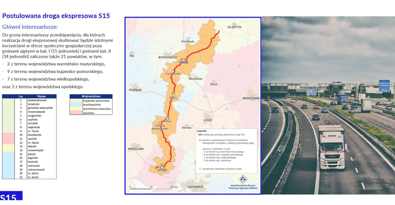 Według Portalu Kujawskiego, zaprezentowana koncepcja ma charakter hybrydowy i łączy elementy obecnych dróg krajowych nr 15 i 25 oraz inicjatywy Via Pomerania. Zakłada ona poprowadzenie trasy S-15 na osi Olsztyn – Toruń – Inowrocław – Konin – Kalisz – Opole. W praktyce oznaczałoby to utrzymanie dotychczasowego przebiegu DK15 na północ od Inowrocławia oraz wykorzystanie DK25 i koncepcji Via Pomerania na południu.